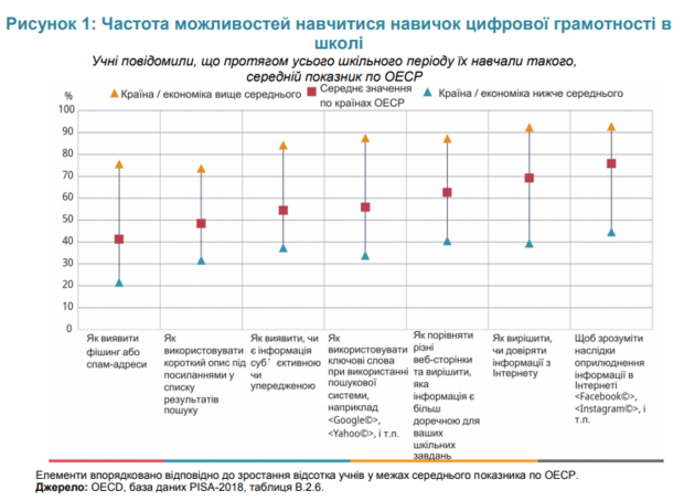 Найменш поширеною навичкою було виявлення фішингу чи електронної пошти зі спамом (76 % та 41 % учнів у країнах ОЕСР повідомили, що їх навчали цього протягом усього періоду навчання в закладі освіти).