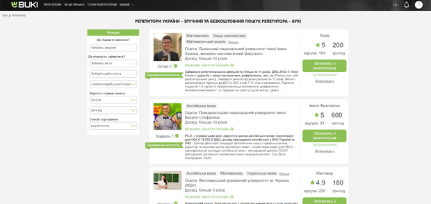 Педагоги родной школы часто бывают слишком загружены. В поисках репетитора по друзьям и знакомым можно потерять драгоценное время, но так и не найти идеального преподавателя для себя. В такой ситуации на помощь придет онлайн-сервис БУКИ. Международная интернет-площадка с понятным и простым интерфейсом предназначена для поиска репетиторов по любым предметам. В базе сайта десятки тысяч специалистов из разных сфер. Отыскать нужного не составит труда.