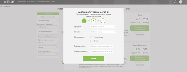 3. Заполнить заявку, указав предмет, уровень, место занятий, периодичность и длительность уроков.