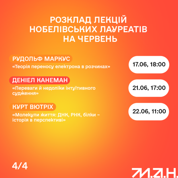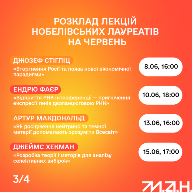 «В июне выступать для украинцев согласились обладатели Нобелевских премий из США, Канады, Израиля, Великобритании, Германии и Швейцарии. Среди них такие суперзвезды, как Дэниел Канеман, которого мы услышим 21 июня, и Джозеф Стиглиц, который прочитает лекцию в контексте российской агрессии 8 июня. Это выступление он подготовил специально для нашего проекта», – отмечает заместитель директора Малой академии наук Евгений Кудрявец.