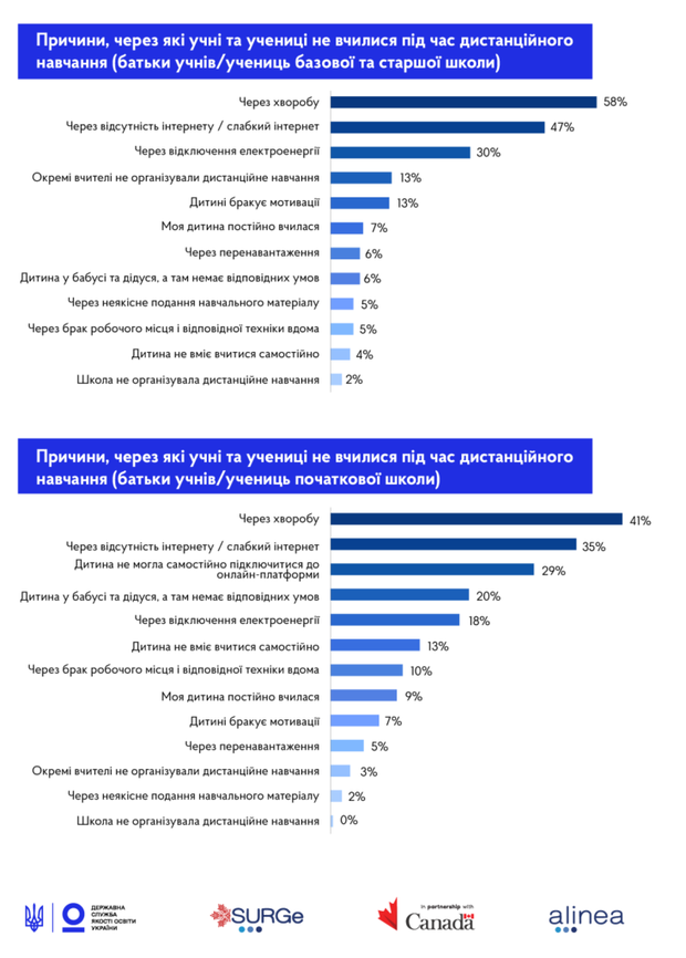 Серед причин, чому діти не могли навчатися або самостійно опрацьовувати навчальний матеріал, батьки найчастіше вказували на хворобу, відсутність інтернету або слабке його з’єднання.