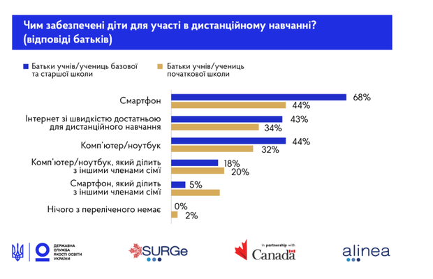 За даними опитування батьків, 39% молодших школярів та 29% старшокласників користуються гаджетами спільно з батьками або братами / сестрами. Найпопулярнішим засобом дистанційного навчання для 93% старшокласників є смартфон, для 64% – комп’ютер / ноутбук.