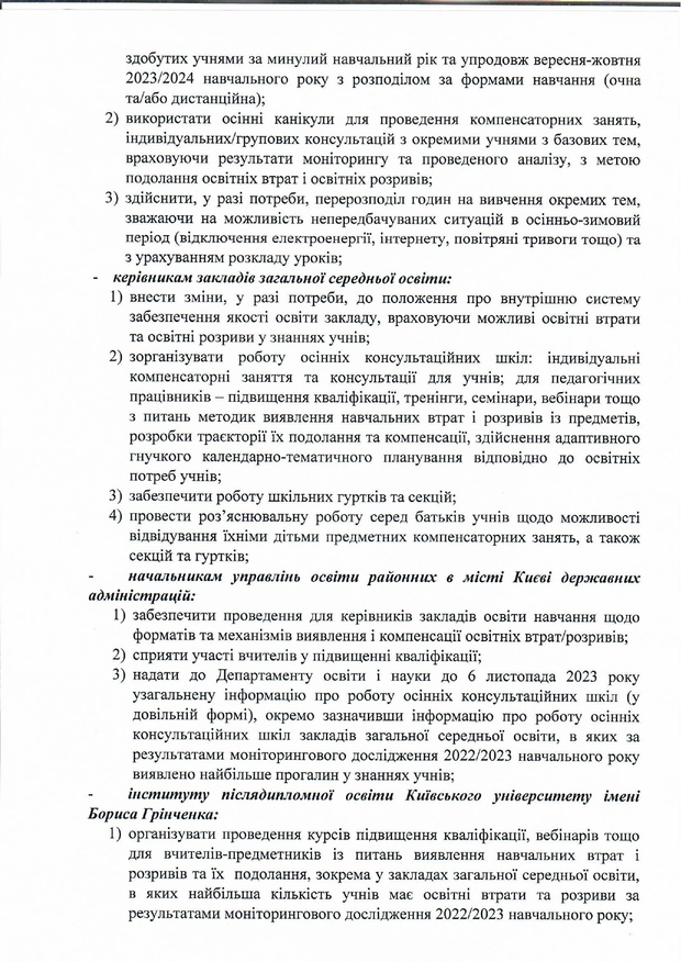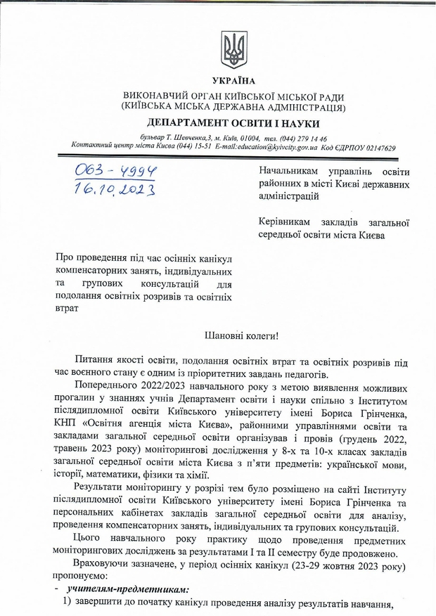 В школах Киева во время осенних каникул будут проводиться компенсаторные занятия и консультации по преодолению образовательных разрывов и образовательных потерь школьников.