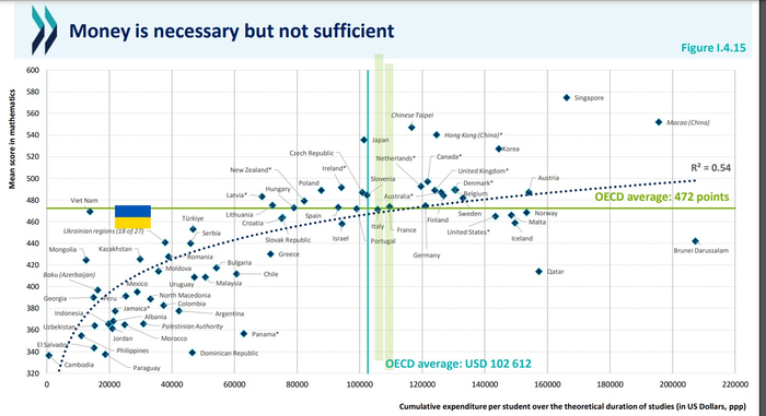 В то же время среди стран, тратящих менее 40 тысяч долларов, Украина имеет одни из лучших результатов учеников по математике, уступая только Вьетнаму.