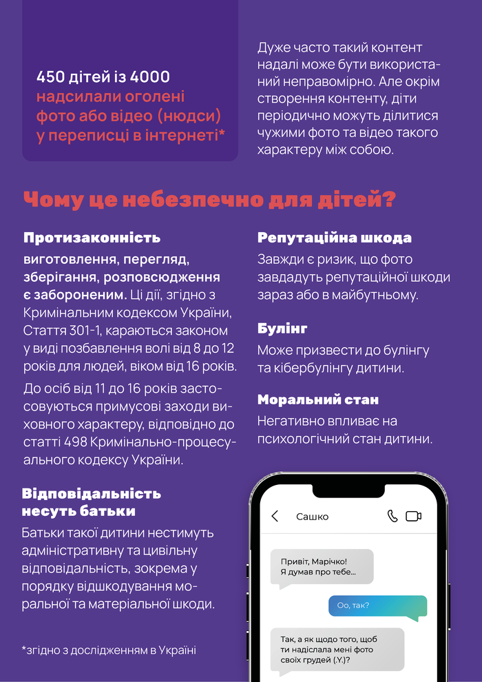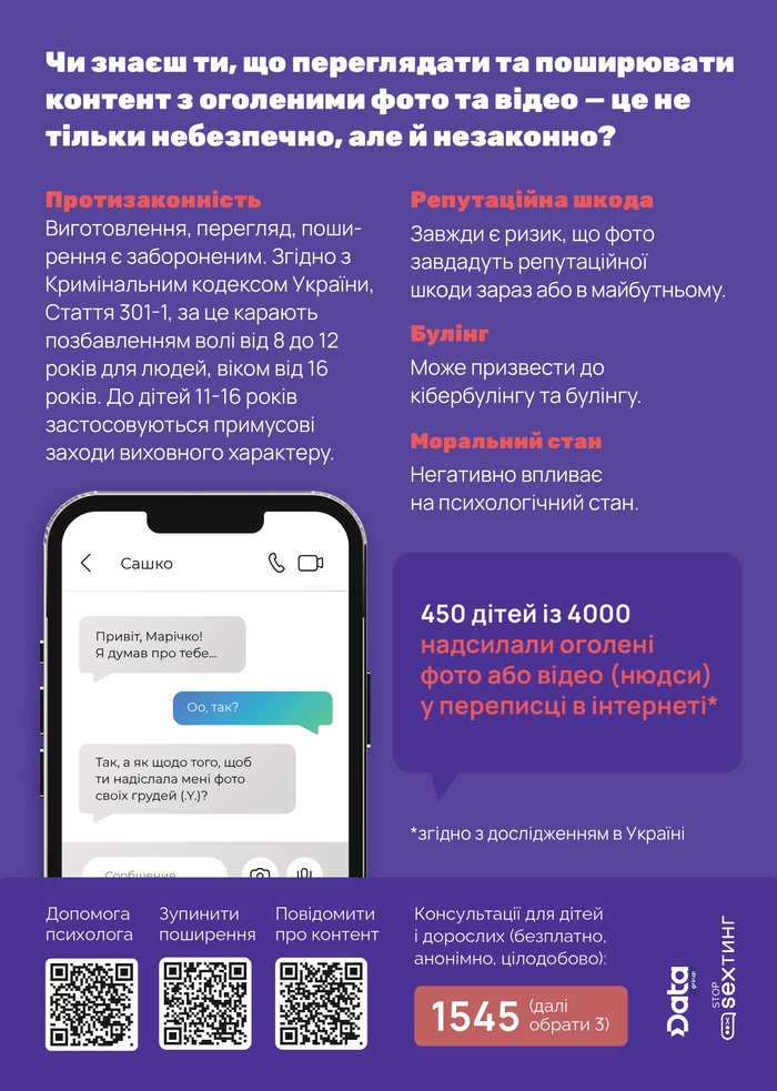 Справка: #stop_sexтинг: #stop_sexтинг - ведущая в Украине общественная организация о защите детей в интернете. Получила премию Глобального договора ООН и в общей сложности научила более 900 000 детей и родителей. В рамках информационной кампании коснулась миллионов украинских семей, а также создала первую в стране консультационную линию безопасности детей в интернете 1545 (далее 3) и психологическую линию поддержки для детей и родителей на тему онлайн-рисков на сайте.