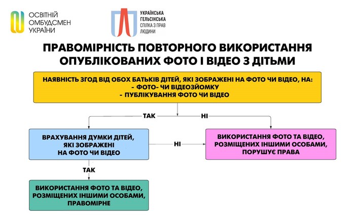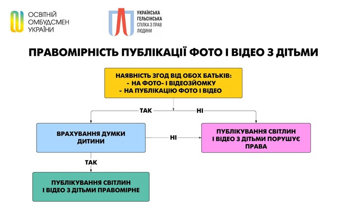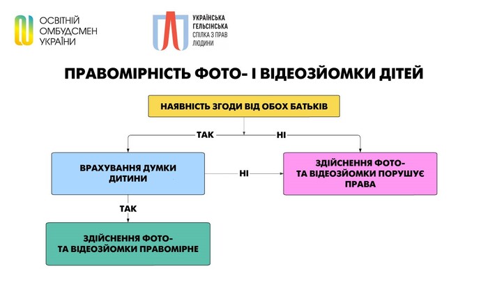 Совместно с Украинским Хельсинкским союзом по правам человека Служба образовательного омбудсмена подготовила публикацию, в которой объясняются определенные правила фотографирования и видеосъемки и публикации учебными заведениями фотографий и видео с несовершеннолетними.