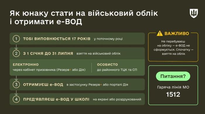Якщо юнак ще не перебуває на обліку, е-ВОД у нього не буде, оскільки документ формується на підставі даних реєстру. У такому випадку школа як орган персонального обліку може нагадати про необхідність з'явитися до ТЦК у встановлені строки.