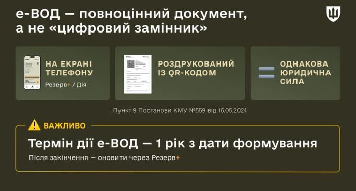 Правовий статус е-ВОД визначений пунктом 9 постанови КМУ №559 від 16 травня 2024 року «Про затвердження Порядку оформлення (створення) та видачі військово-облікового документа для призовників, військовозобов'язаних та резервістів»: електронний військово-обліковий документ у будь-якій формі – відображений на екрані телефону або роздрукований – має однакову юридичну силу незалежно від форми пред'явлення.