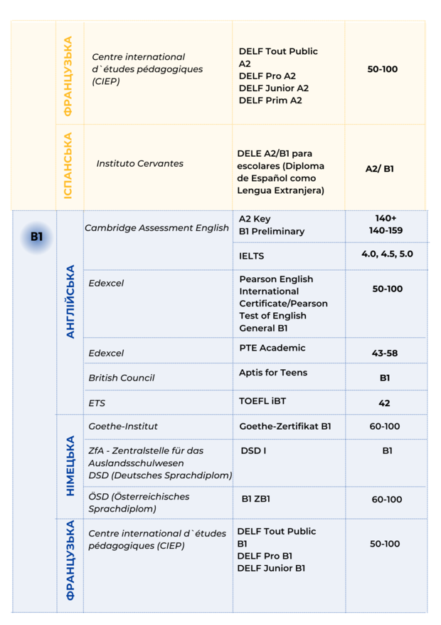 Список международных сертификатов, которые могут засчитываться как оценка за ДПА по иностранному языку.