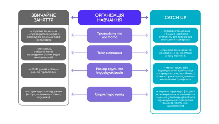 Второй важный аспект, отличающий обычный урок от catch up – это содержание и методика преподавания. Ведь при наверстании основной акцент сконцентрирован на заполнении пробелов в знаниях, фокус на ключевых темах, где у детей есть пробелы. А также использование адаптивных обучающих платформ и более частого оценивания для обратной связи.