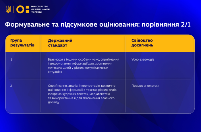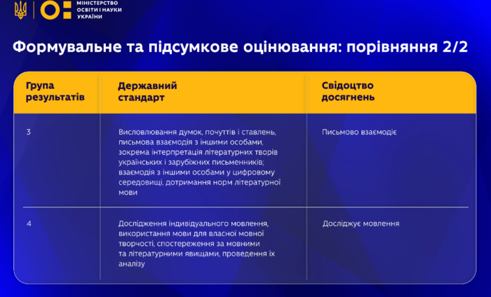 Відповідно до Державного стандарту 2011 року оцінювання було більш орієнтовано на знання. У нових стандартах у центрі ‒ обов'язкові результати навчання учнівства, які реалізовуємо через компетентнісний підхід.