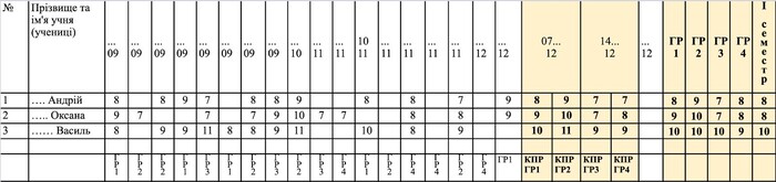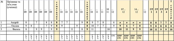 Зауважимо, що оцінки за семестр виставляють у відповідні стовпці за групами результатів, а вже потім ‒ загальну оцінку. Наприклад, під час оцінювання з історії України вчитель / вчителька орієнтується на три групи результатів. Відповідно у журналі наприкінці семестру виставляє чотири оцінки: три за кожну групу результатів і загальну оцінку на основі оцінювання груп результатів.