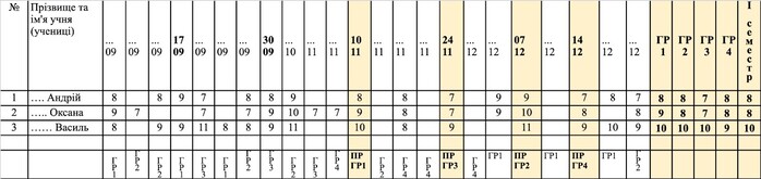 Позначати групу результатів, з якою ви працюєте, можна не внизу стовпця з датою, а на сторінці змісту уроку. Тоді тут, крім власне змісту, дописують: «ПО ГР1» (це означає, що ви поточно оцінювали групу результатів 1). Якщо ви оцінювали інші групи результатів, аналогічно до ГР1 це зазначаєте.