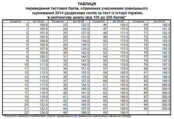 Таблица перевода тестовых баллов по истории Украины в 200-балльную шкалу 2014 года (дополнительная сессия):