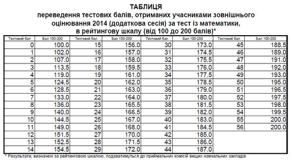 Таблица перевода тестовых баллов по математике в 200-балльную шкалу 2014 года (дополнительная сессия):