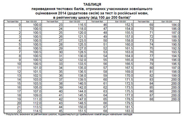 Таблица перевода тестовых баллов по русскому языку в 200-балльную шкалу 2014 года (дополнительная сессия):