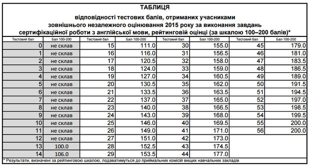 Таблица перевода тестовых баллов по английскому языку в 200-балльную шкалу 2015 года: