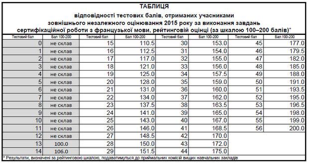 Таблица перевода тестовых баллов по французскому языку в 200-балльную шкалу 2015 года: