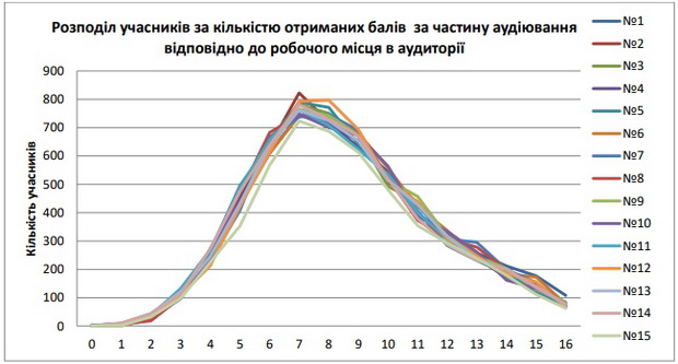Зауваження про різні умови тестування від осіб, які працювали біля потенційних джерел шуму (вікон), на віддалених від аудіопристрію місцях тощо також не підтвердилися – розподіл результатів учасників тестування красномовно свідчить про відсутність будь-яких суттєвих відмінностей у результатах здобутих учасниками на різних місцях в аудиторії (див. графік нижче).