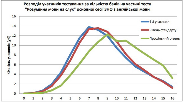 Аналіз попередніх результатів тестування вказує на те, що частина «Розуміння мови на слух» (аудіювання) тесту з англійської мови має високі психометричні характеристики. Розподіл результатів учасників тестування наближається до нормального, що свідчить про належну якість цієї частини тесту.