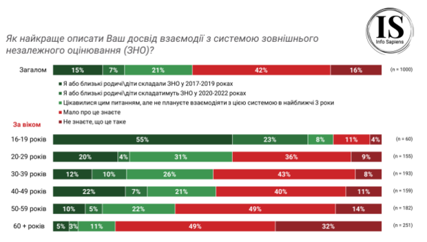 В общем, опыт взаимодействия с системой внешнего независимого оценивания (ЗНО) за 2017-2019 гг. имеет 15% опрошенных, еще 7% планируют взаимодействовать в 2020-2022 гг. - они сами или их родственники/дети будут сдавать ЗНО. Таких людей ожидаемо больше в возрастной категории 16-19 лет.