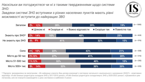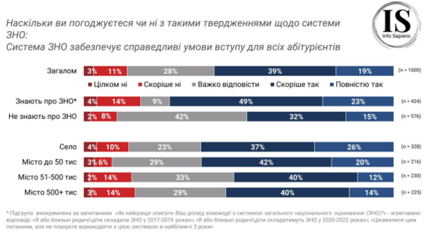 По результатам ежемесячного опроса Omnіbus Іnfo Sapіens, 58% опрошенных согласны или скорее согласны с тем, что система ЗНО обеспечивает справедливые условия поступления для всех абитуриентов. Также более половины опрошенных (58%) согласны, что благодаря системе ЗНО абитуриенты из разных населенных пунктов имеют равные возможности поступить в лучшие УВО.