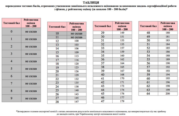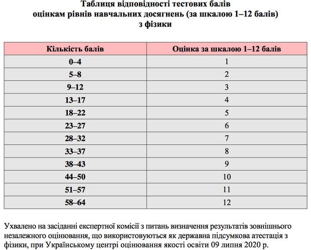 Поскольку результаты внешнего оценивания по физике могут быть учтены как государственная итоговая аттестация за школьный курс по предмету, Украинским центром оценивания качества образования составлена и утверждена отдельная таблица перевода тестовых баллов в шкалу 1-12 баллов.
