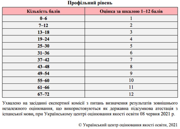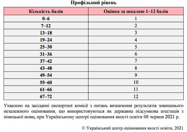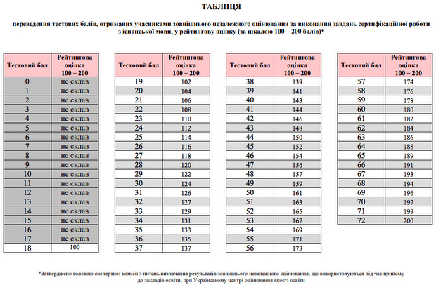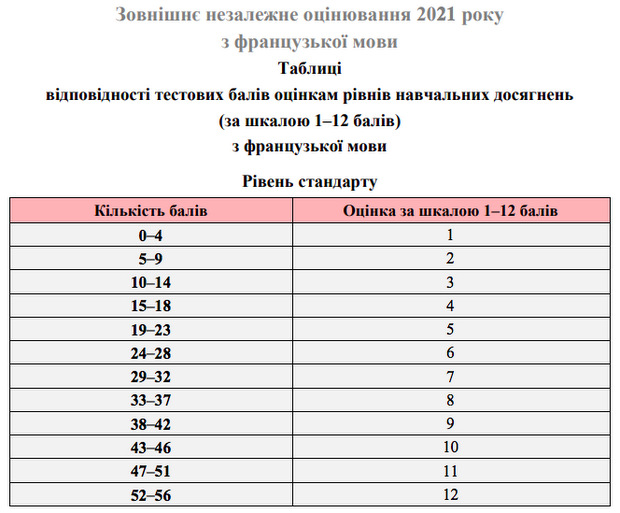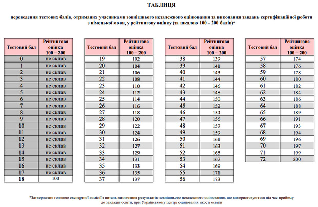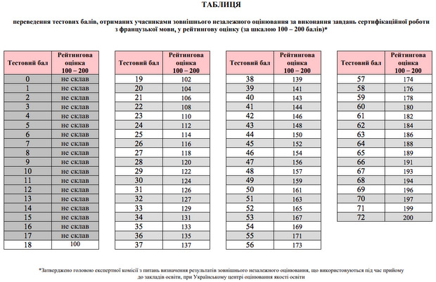 Поскольку результаты внешнего оценивания могут быть засчитаны как государственная итоговая аттестация за школьный курс по немецкому, французскому или испанскому языку, Украинским центром оценивания качества образования составлены и утверждены отдельные таблицы перевода тестовых баллов в шкалу 1-12 баллов.