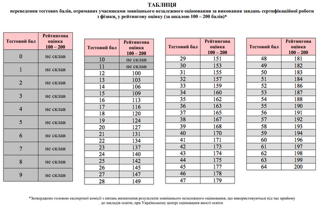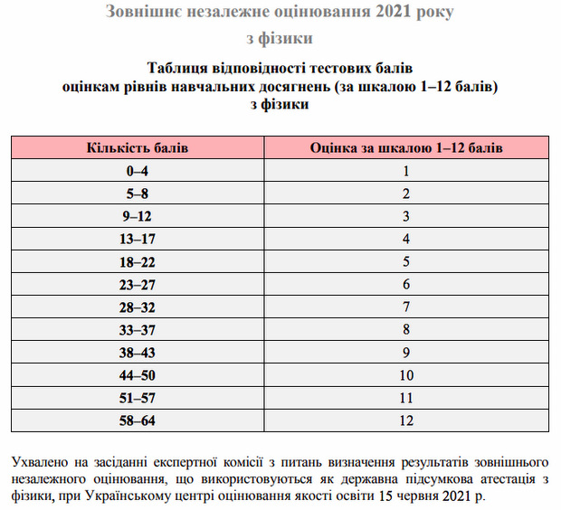 Поскольку результаты внешнего оценивания по физике могут быть засчитаны как государственная итоговая аттестация за школьный курс по предмету, Украинским центром оценивания качества образования составлена и утверждена отдельная таблица перевода тестовых баллов в шкалу 1-12 баллов.