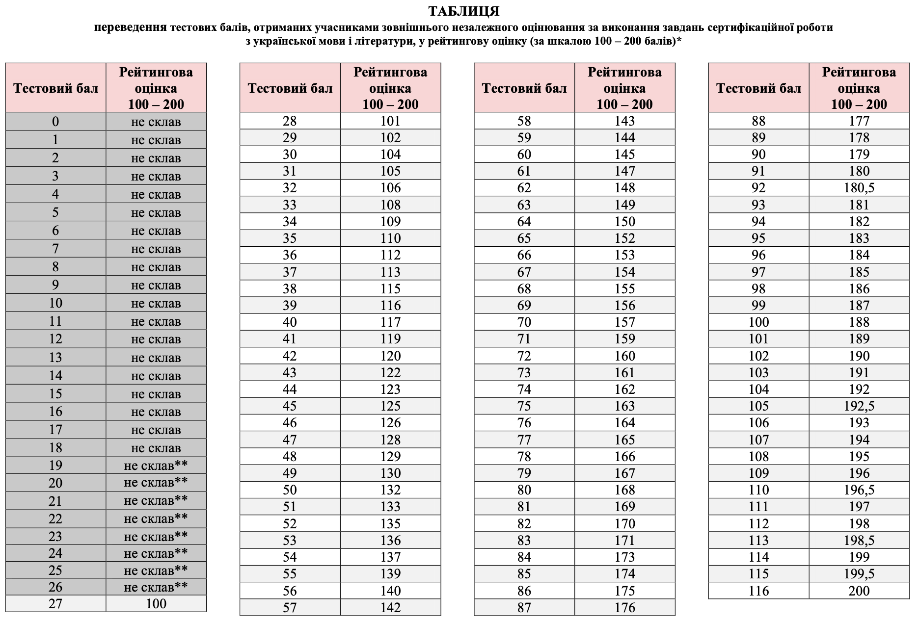 Таблица перевода тестовых баллов по украинскому языку и литературе в 200-балльную шкалу: