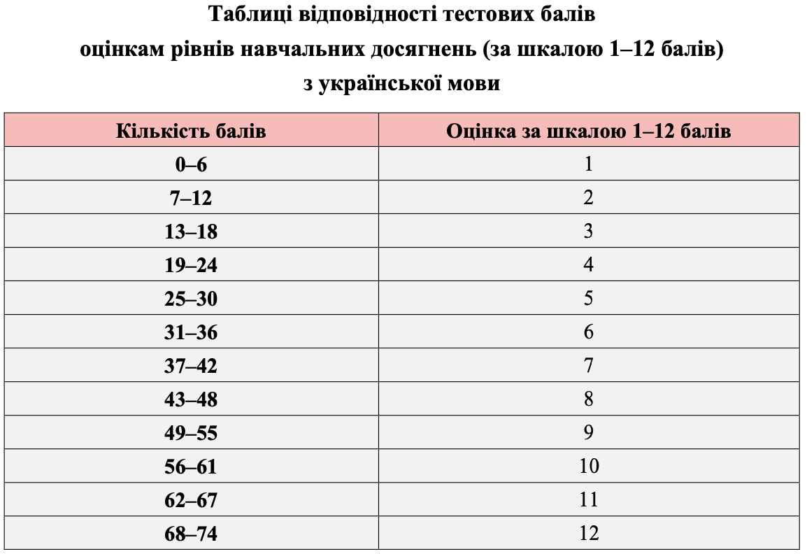 Таблица перевода тестовых баллов по украинскому языку в шкалу 1-12 баллов: