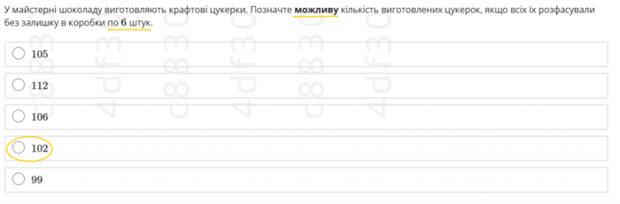 Кроме практической направленности задания, стоит отметить его простоту. В условии задания четко указано, что конфеты фасовали по 6 штук и ни одной не осталось, поэтому решение задачи состоит в выборе из предложенных чисел того, которое делится нацело на 6. Подобные задачи ученику впервые встречаются в учебниках по математике для 3 класса! Решение задачи можно оптимизировать, используя признаки делимости на 2 и 3, изучаемые в 6 классе. Очевидно, упреки о наличии в тестах по математике исключительно логарифмов и интегралов безосновательны.