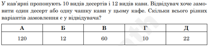 Посетитель может выбрать один вид кофе из двенадцати предложенных (разумеется, таких вариантов 12) и один из десяти десертов (10 вариантов). 12+10=22 варианта выбора. Очевидно, что все другие варианты ответа неправильны.