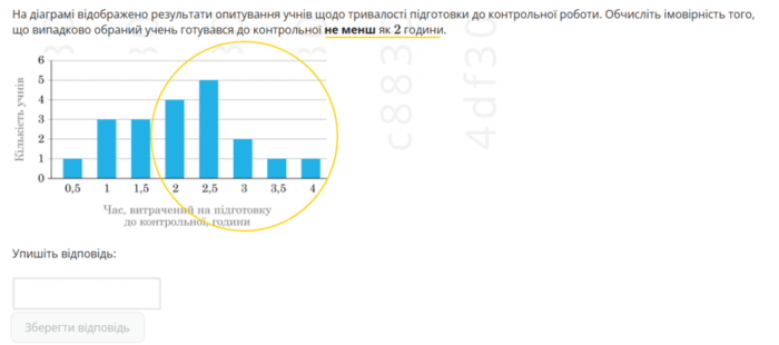 Для решения задания по данным, приведенным на диаграмме, нужно определить общее количество опрошенных учеников: 1+3+3+4+5+2+1+1=20 и количество учеников, потративших на подготовку к контрольной работе не менее 2 часов: 4+5+2+1+1=13. Используя формулу для нахождения вероятности, которая размещена в дополнительных материалах по математике, делим 13 на 20 и получаем правильный ответ – 0,65.