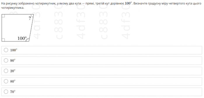 В условии задания четко указано, что четырехугольник имеет два прямых угла, а третий угол равен 100⁰. Используя тот факт, что сумма углов любого четырехугольника равна 360⁰, получим... Отметим, что в «свободном переводе условия» в так называемых «сливах» заданий речь не идет о градусной степени углов, а представлен только рисунок.
