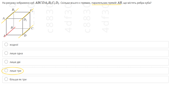 Выполнение задания не требует дополнительных знаний, кроме понимания понятия параллельности прямых (6 класс). Факт параллельности устанавливают зрительно с рисунка. Чтобы избежать ошибки, можно приложить ручку или лист бумаги (черновика) и убедиться в параллельности соответствующих ребер.