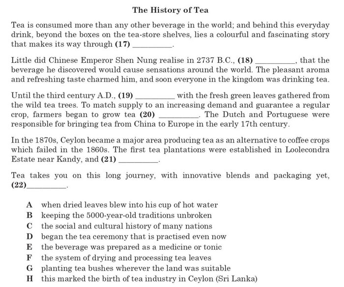 Перше речення в тексті, у якому є пропуск до завдання 17, містить доволі просту (побутову) лексику і перекладається так: Чай споживають більше, ніж будь-який інший напій у світі; і за цим повсякденним напоєм, за коробками на полицях чайних магазинів, ховається барвиста і захоплююча історія, яка пробивається крізь (17) __________ («Tea is consumed more than any other beverage in the world; and behind this everyday drink, beyond the boxes on the tea-store shelves, lies a colourful and fascinating story that makes its way through (17) __________»). Відповідно до змісту речення продовженням його, а отже, і правильною відповіддю є варіант C the social and cultural history of many nations (соціальну та культурну історію багатьох народів), який узгоджується з контекстом і за змістом, і граматично.