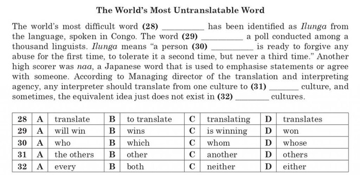 Як було зазначено раніше, окрім завдань на читання, у тесті НМТ з англійської мови є також блок завдань «Використання мови». Такі завдання можна виконати доволі добре, навіть не опанувавши на високому рівні навички читання з розумінням, але маючи уявлення про лексичні й граматичні конструкції англійської мови. Тож, було б логічно припустити, що тут п. Ізабель як носійка мови не припуститься помилок. Утім, як свідчать результати «експерименту», і тут були певні проблеми, а саме із завданням 30, за допомогою якого в тесті перевіряють уміння учасників НМТ правильно використовувати граматичні форми відповідно до контексту.