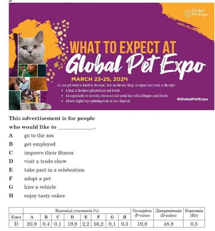 За допомогою цього завдання перевіряли вміння розуміти основний зміст прочитаного. За статистичними даними, аналізоване завдання виявилося складним для багатьох учасників п’ятої сесії НМТ–2024: правильно його виконали 19,8% вступників. Причина вибору неправильних відповідей у тому, що для виконання завдання необхідно не просто роздивитися картинку оголошення, а й обов’язково прочитати текст, який наведено на цій «картинці». Щоб визначити основну тему тексту, треба було виділити ключові слова або фрази в цьому короткому рекламному тексті та з’ясувати, що це такі фрази: «global pet expo» (міжнародна виставка домашніх тварин), «a look at the latest pet products and trends» (ознайомитися з останніми тенденціями та товарами для домашніх тварин). На підставі цього одразу стає зрозуміло, що в тексті йдеться НЕ про придбання домашньої тварини, а про виставку. Ось чому варіант відповіді D visit a trade show (відвідати виставку) буде єдиним правильним з усіх запропонованих у завданні 5 варіантів відповідей.