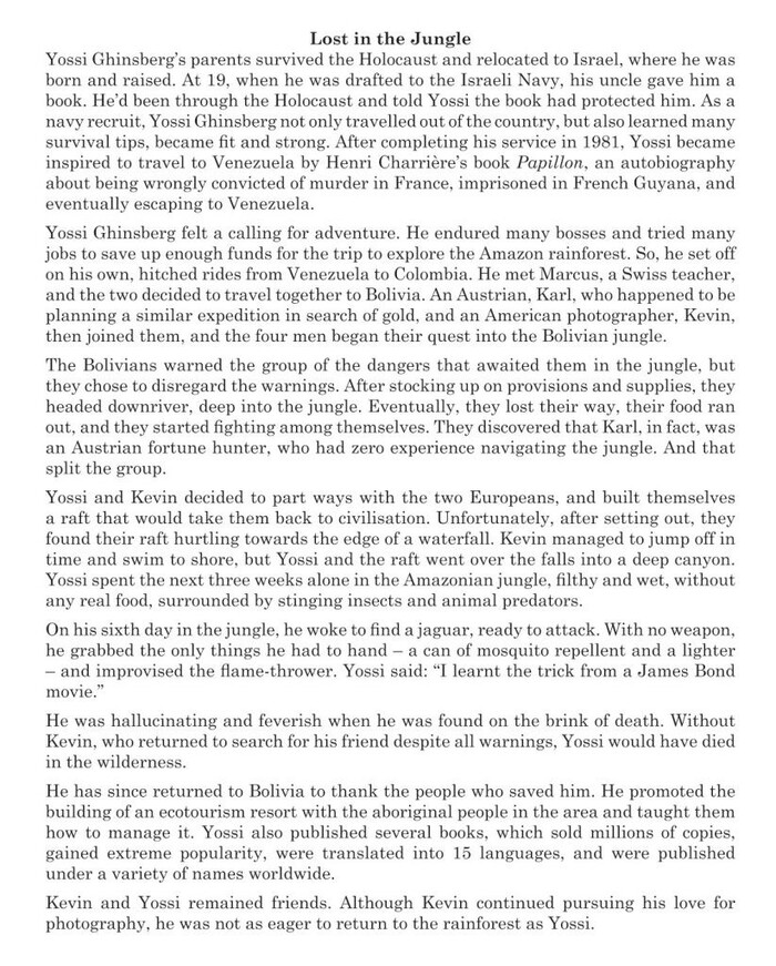 Відповідь на запитання «Що допомогло Йосі Гінзбергу вижити в джунглях?», знаходимо в п’ятому абзаці тексту: «On his sixth day in the jungle, he woke to find a jaguar, ready to attack. With no weapon, he grabbed the only things he had to hand – a can of mosquito repellent and a lighter – and improvised the flame-thrower» (На шостий день перебування в джунглях він прокинувся і побачив ягуара, готового до нападу. Не маючи зброї, він схопив єдине, що було під рукою – балончик з репелентом від комарів і запальничку – і нашвидку зробив з них вогнемет). Відповідно, серед запропонованих варіантів відповіді вибираємо варіант B a flame-providing device (пристрій для подачі / забезпечення полум’я). Саме цей варіант відповідає контексту та є правильною відповіддю. І, як бачимо зі статистичних даних, для учасників тестування це завдання було легким: 62,8% абітурієнтів упоралися з ним.