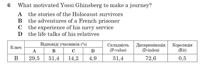 Як видно зі статистичних даних, 51,4 % учасників п’ятої сесії НМТ обрали правильну відповідь на завдання 6, зрозумівши, що для виконання завдання потрібно уважно прочитати перший абзац тексту й відповісти на запитання щодо того, що саме мотивувало головного героя до подорожування. Останнє речення абзацу прямо відповідає на це запитання, адже в ньому вказано, що мотивувала п. Гінзберга автобіографічна книга неправомірно засудженої людини. Звичайно, у першому абзаці тексту трапляються слова з інших варіантів відповіді, тож неуважний читач, як-от і п. Ізабель, обере саме їх. До речі, подібні помилки часто роблять українські 15-річні підлітки, виконуючи завдання PISA: замість аналізувати текст, вони просто шукають у варіантах відповіді слова, які бачили в тексті.