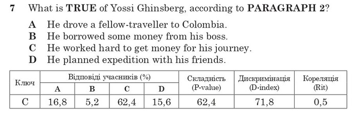 Відповідь на запитання 7 необхідно шукати в другому абзаці тексту, адже про це прямо сказано в умові: «Yossi Ginsberg felt a calling for adventure. He endured many bosses and tried many jobs to save up enough funds for the trip to explore the Amazon rainforest» (Йосі Гінзберг відчував поклик до пригод. Він витримав багатьох начальників і перепробував багато робіт, щоб накопичити достатньо коштів для подорожі в тропічні ліси Амазонки). Ознайомившись з відповідним абзацом, серед запропонованих варіантів відповіді вибираємо варіант C He worked hard to get money for his journey (Він важко працював, щоб зібрати гроші на подорож), адже саме це випливає з контексту. До речі, відповідно до статистики, це завдання для учасників тестування було легким, тож 62,4 % абітурієнтів успішно впоралися з ним.