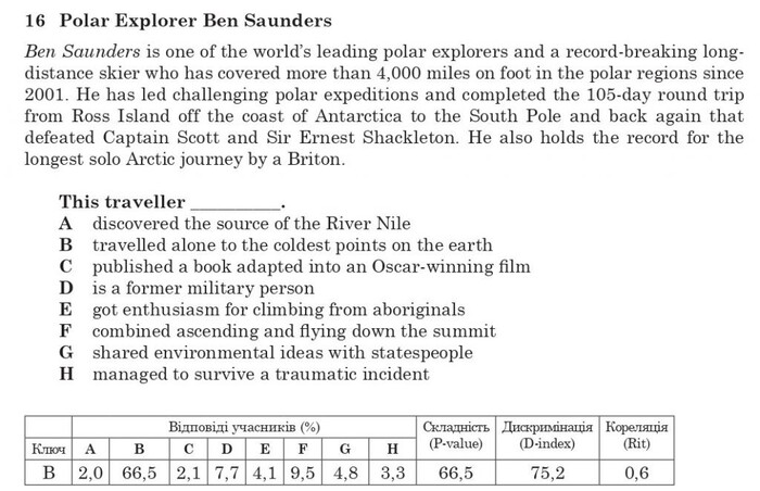 Завдання 16, з яким не впоралася п. Ізабель, правильно змогли виконати понад 60% українських учасників п’ятої сесії тестування. У тексті до цього завдання розповідається про провідного полярника й дослідника світу Бена Сондерса. Ми дізнаємося, що п. Сондерсу належить рекорд найдовшої одиночної арктичної подорожі, яку коли-небудь здійснював британець (He also holds the record for the longest solo Arctic journey by a Briton). І саме тому правильною відповіддю на це завдання буде твердження B travelled alone to the coldest points on the earth (подорожував наодинці до найхолодніших точок на Землі), що відповідає контексту. Це завдання було легким для учасників тестування (див. табличку нижче).