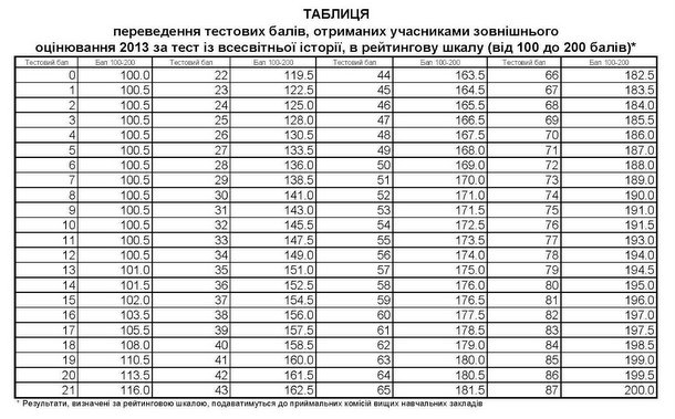 Таблица перевода тестовых баллов по всемирной истории в 200-балльную шкалу 2013 года: