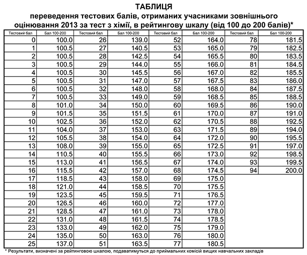По результатам тестирования Украинским центром оценивания качества образования обнародована таблица соответствия количества тестовых баллов, полученных участниками ВНО за тест по химии в 2013 году, в рейтинговой шкале (100-200 баллов).