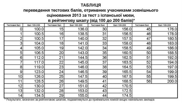 По результатам тестирования Украинским центром оценивания качества образования опубликована таблица перевода тестовых баллов, полученных участниками внешнего независимого оценивания за тест по испанскому языку в 2012 году, в рейтинговую шкалу (100-200 баллов).