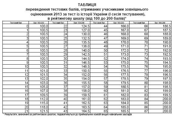 По результатам тестирования Украинским центром оценивания качества образования опубликованы две таблицы перевода тестовых баллов, полученных участниками внешнего независимого оценивания за тест по истории Украины в 2013 году (отдельно для каждой сессии), в рейтинговую шкалу (100-200 баллов).