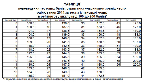 По результатам тестирования Украинским центром оценивания качества образования опубликована таблица перевода тестовых баллов, полученных участниками внешнего независимого оценивания за тест по испанскому языку в 2014 году, в рейтинговую шкалу (100-200 баллов).