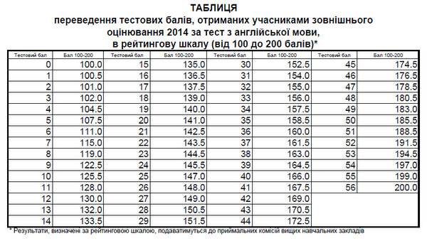 По результатам тестирования Украинским центром оценивания качества образования опубликована таблица перевода тестовых баллов, полученных участниками внешнего независимого оценивания за тест по английскому языку в 2014 году, в рейтинговую шкалу (100-200 баллов).
