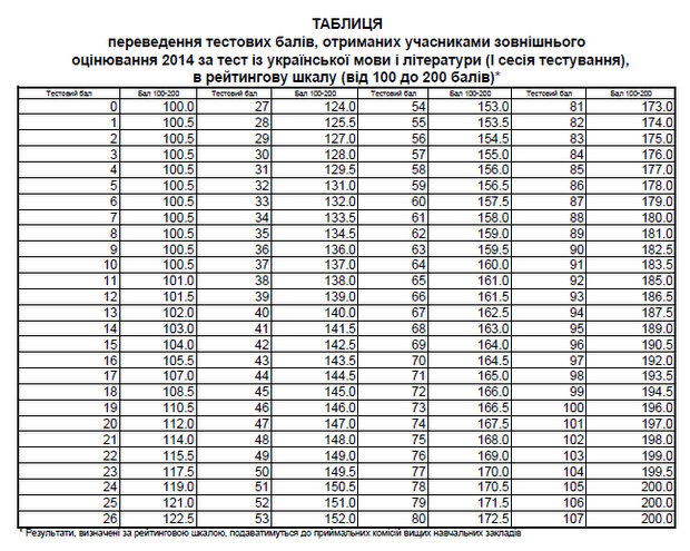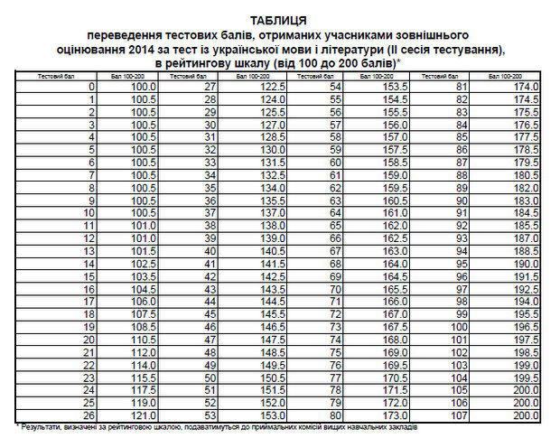 По результатам тестирования Украинским центром оценивания качества образования обнародована таблица перевода тестовых баллов, полученных участниками внешнего независимого оценивания за тест по украинскому языку и литературе в 2014 году, в рейтинговую шкалу (100-200 баллов).